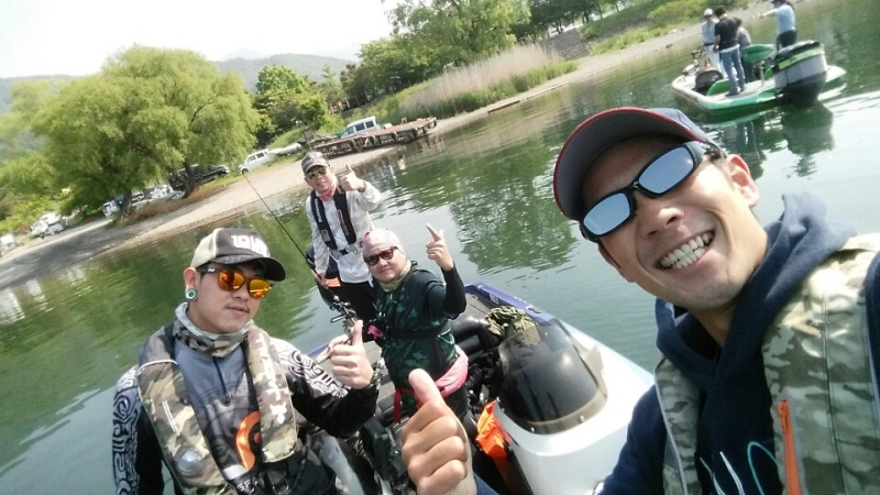 河口湖でガイドされている荻野プロと柴田プロと出船。