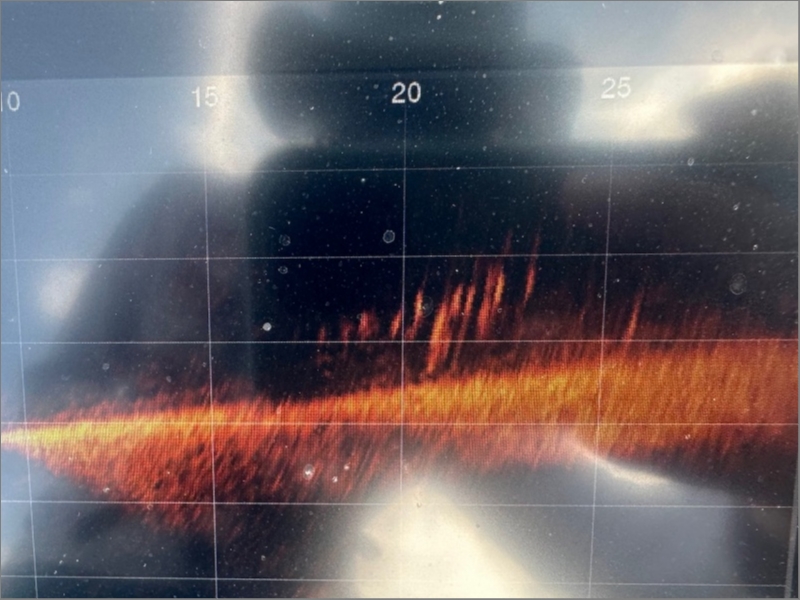 シャローのウィードでワカサギを食べている魚達がまだ多く居る一方、シャローのウィードからワカサギもバスも抜けて、深場に入りフィーディングしているエリアも。(↑写真)